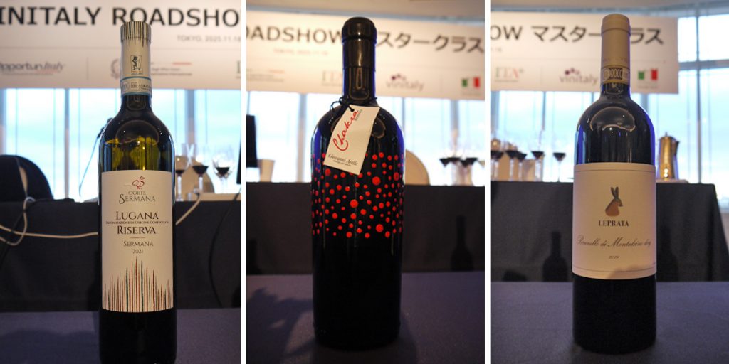 写真左から「ルガーナ DOC リゼルヴァ セルマーナ 2021」、「チャクラ・ロッソ 2023」、VILLA LE PRATAの「ブルネッロ・ディ・モンタルチーノ DOCG 2019」